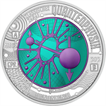 The obverse of Quantum Physics features Schrödinger’s cat, the thought experiment illustrating quantum superposition. The cat’s face dominates the niobium core, its eyes representing the superposition of the states ‘alive’ and ‘dead’. Around the cat, extending to the edge of the coin, are an unstable atom, a Geiger counter scale, a radioactivity symbol and the observer. The abbreviation of Schrödinger’s equation can be seen at the top of the coin.